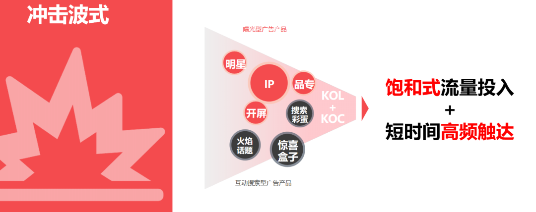总结来说,冲击波营销解法适用于预算量级大的品牌,饱和式流量投入+短时间高频触达