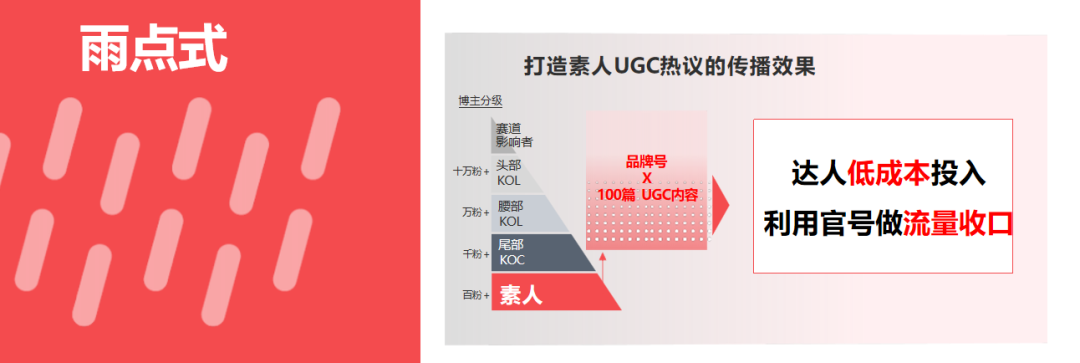 总结来说,雨点式营销解法适用于预算量级比较少的品牌,优点是低成本投入,利用官号做流量收口,一种极致性价比投放方式;缺点是比较考验品牌号的运营,如果品牌号内容做的不够好,可能会不太容易吸引到“种草官”参与活动。参与产品置换和KOC的内容上也容易出现内容同质化的情况,毕竟KOC的创作内容还是比较有限的