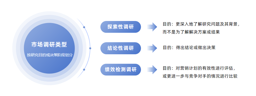 如果从研究目的或决策阶段的维度划分,市场研究可以分为以下三类: