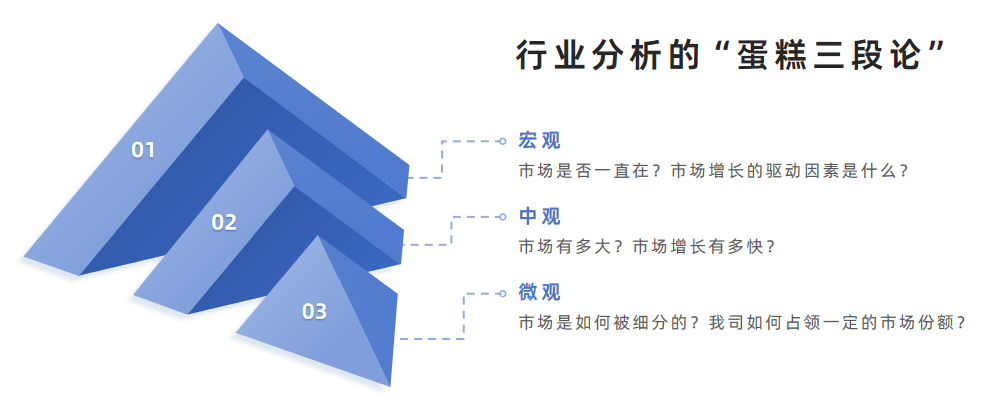 除此之外,我的一位老师曾经教过另一个框架,贯穿宏观、中观和微观,个人觉得好用又好记 —— “蛋糕三段论”(将市场比喻成蛋糕),蛋糕的三层分别是:
