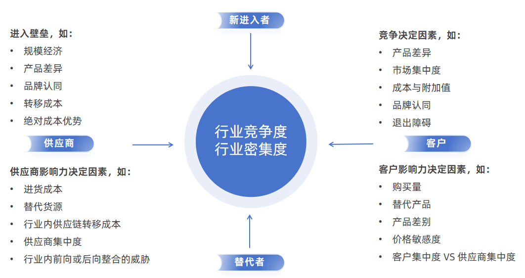 理论框架很多商业课程和书籍都有介绍。比如,PEST是宏观分析框架,一般在行业分析之前用,鉴于中国国情,建议考虑PESTEL,在PEST的基础上增加了环境(Environment)和法律/合规政策(Legal);波特五力是中观分析框架,较常用于行业分析(如下图,供参考);SWOT偏微观分析框架,从企业自身入手,结合外部机遇做分析。另外,市场分析常用的还有5C框架。