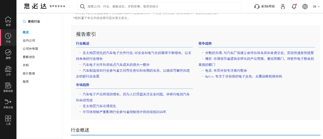 SPEEDA的行业分析细分到了560个,结合了很多数据源,做了大量的数据分析。如果大家资源有限,可以重点参考我们的概述章节(如下图),结构内容较完整,可以作为探索性调研的参考。