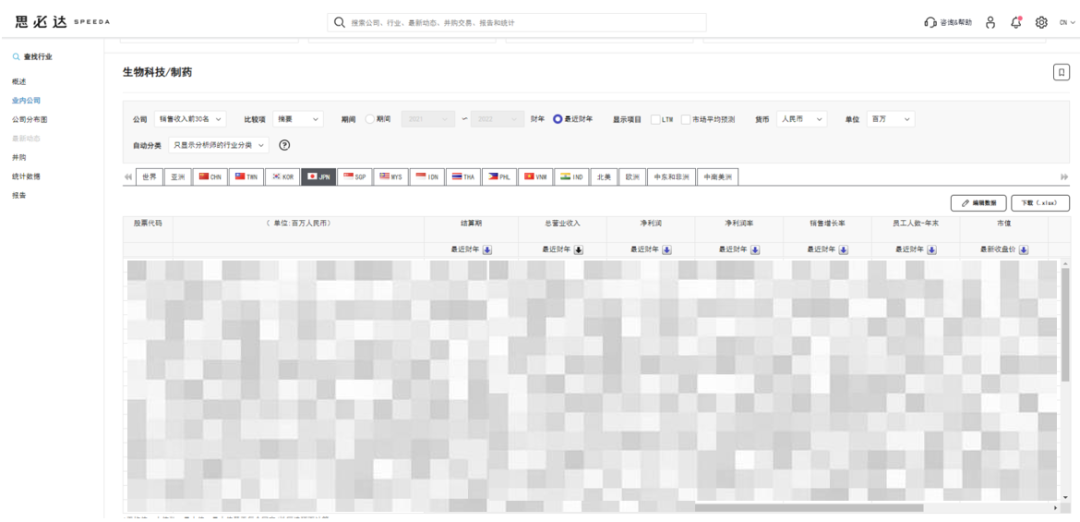 其中竞争趋势部分,可以结合市场集中度、产品矩阵和新产品布局、供应链及生态合作、行业并购和企业组织变化等进行分析。关键数据指标包括:市场份额、行业营业利润率、M&A、头部代表企业的财务数据等。比如,在总结业内代表公司数据时,如果是跨国公司,可以按照国家/地区,及指定财务指标做数据的可视化呈现,以生物科技/制药行业为例,如下图一,罗列了日本销售收入前30名的企业和财务数据;下图二,将企业2016-2022财年的营收利润率的分布做了可视化呈现。