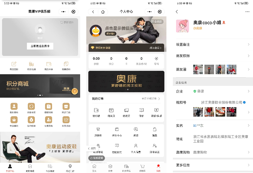 进入小程序【奥康会员中心】,可以找到奥康企微引流的触点。