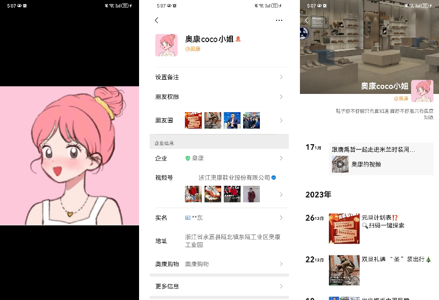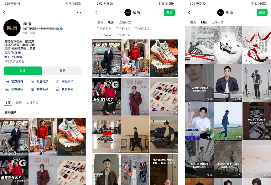 视频号【奥康】,主要以品牌宣传、产品推广等内容,首页设置公众号、企微引流的触点,用户点击即可添加企微福利官。
