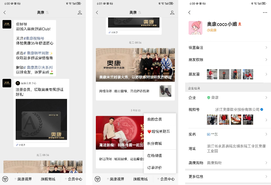奥康建立了“公众号+小程序+企微+社群”等渠道为核心的私域矩阵,并借助当下热门的抖音、小红书、微博等公域平台,实现公私域的引流转化并帮助品牌扩大声量。
