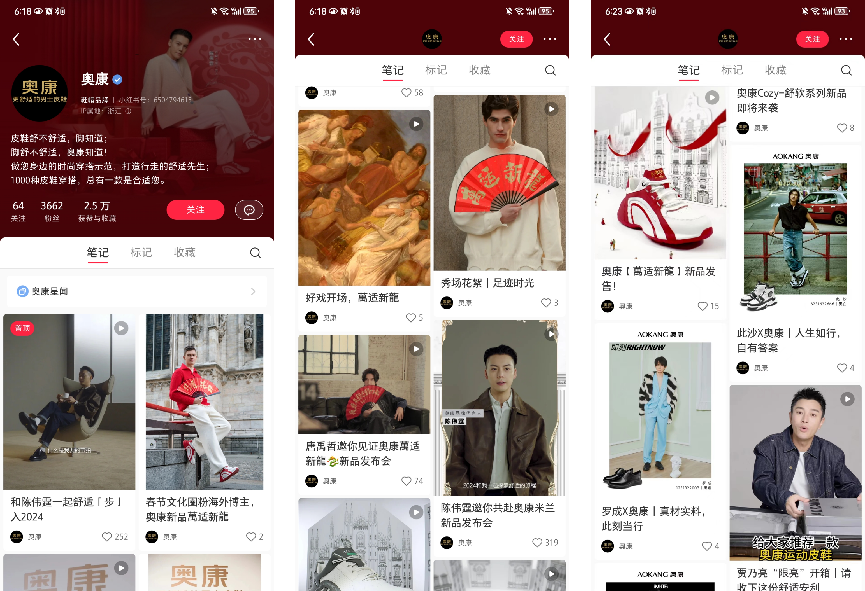 奥康在小红书的账号有3662粉丝,获赞与收藏2.5w。账号主要是品牌活动和产品推广等内容。