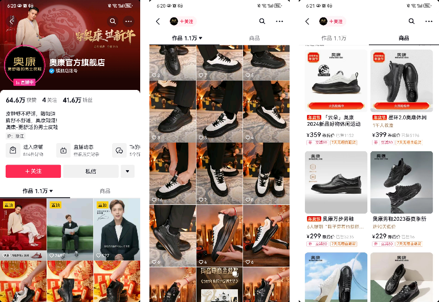 奥康在抖音有41.6w粉丝,获赞64.6w。账号内容以品牌介绍、产品推广、活动宣传为主。