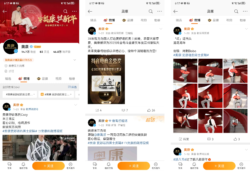 奥康在微博有14.7w粉丝,转赞评46.8w。微博会分享有奖互动、活动宣传、产品介绍等内容。