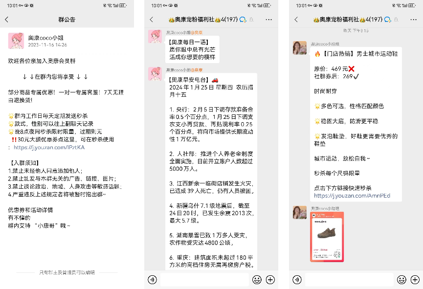 奥康的主要侧重于活动的宣传,吸引用户产生消费。社群内容建立了SOP,一天多个时段推送用户。