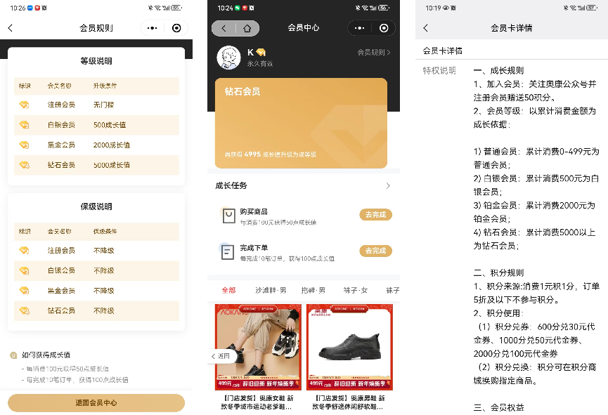 奥康在小程序和电商平台都建立了相应的会员体系,都以成长型会员+积分体系为主,下面拆解小程序会员体系。