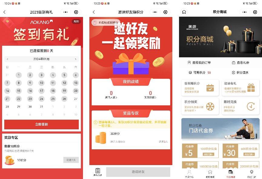 除了成长会员外,奥康也搭建了自己的积分体系。用户可通过签到、购物等方式获取积分。