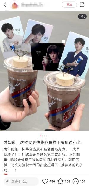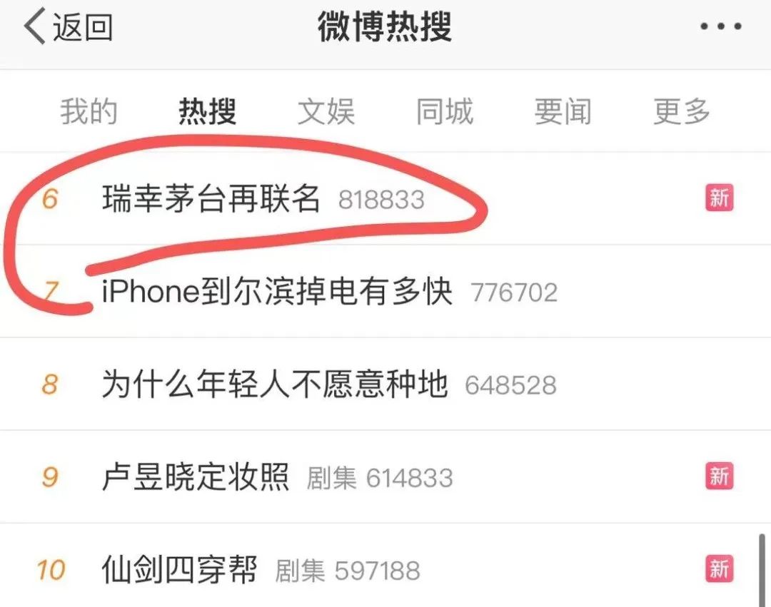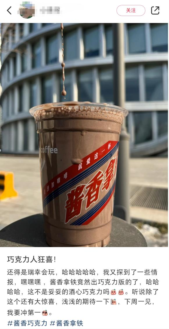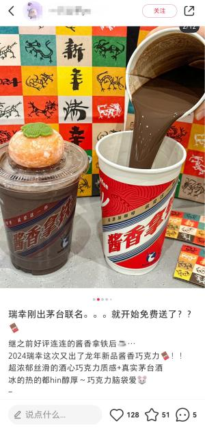 瑞幸去年和茅台搞过一次联名,到底有多火我们就不赘述了,也就单品首日销量额破1亿,路上联名纸袋比公文包还多的程度。就在上周,瑞幸推出了与茅台联名2.0版本——龙年酱香巧克力,再次成为社交平台上的热议话题!甚至还没上线,就直接冲上微博热搜。