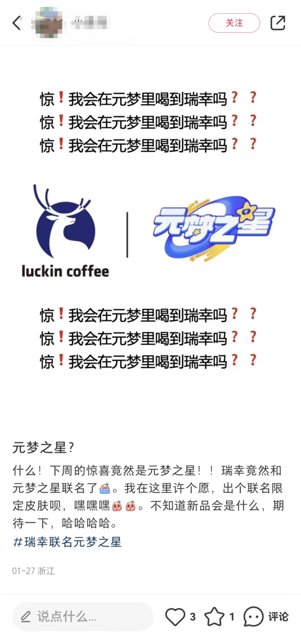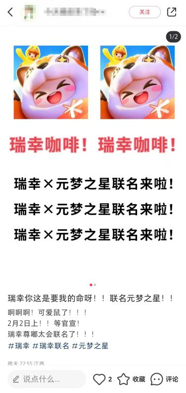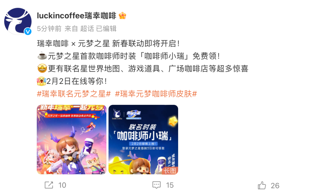 比方说,与茅台联名的2.0版本龙年酱香巧克力,迎合了“咖啡时髦精”们爱尝鲜、爱分享的消费诉求;寓意美好的红龙拿铁、好柿大福和抽奖活动,则为那些想要在春节期间讨个彩头的消费者,提供了满满的仪式感;与韩美林联名的物料,不仅满足了国潮爱好者的审美,也让手工达人们有了更多灵感和素材;为代言人粉丝送出的四重惊喜,既是对代言人号召力的认可,也与粉丝建立了深层次的交流;而与《元梦之星》的联动,也让假期开黑党感受到品牌对自己的关注...