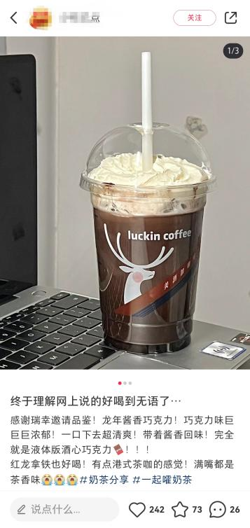 有已经尝鲜的网友表示,入口很醇香,酒味比酱香拿铁要淡一点,口味偏甜,有种童年记忆中酒心巧克力的味道。而且从大家晒出的评价里看,“冰巧”和“热巧”是两种完全不同的风味,这也引发了更多消费者的兴趣。不仅如此,瑞幸还狂送10万杯酱香,买一杯就能抽一次,让大家找到了刮刮乐的快乐!
