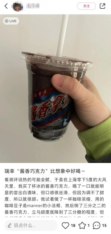 其实产品正式推出之前,也有人对这种脑洞大开的新口味持怀疑态度。但是当它出现在点单页面之后,大家高低还是想尝尝这款新联名,看看白酒+巧克力+咖啡能碰撞出什么惊喜。
