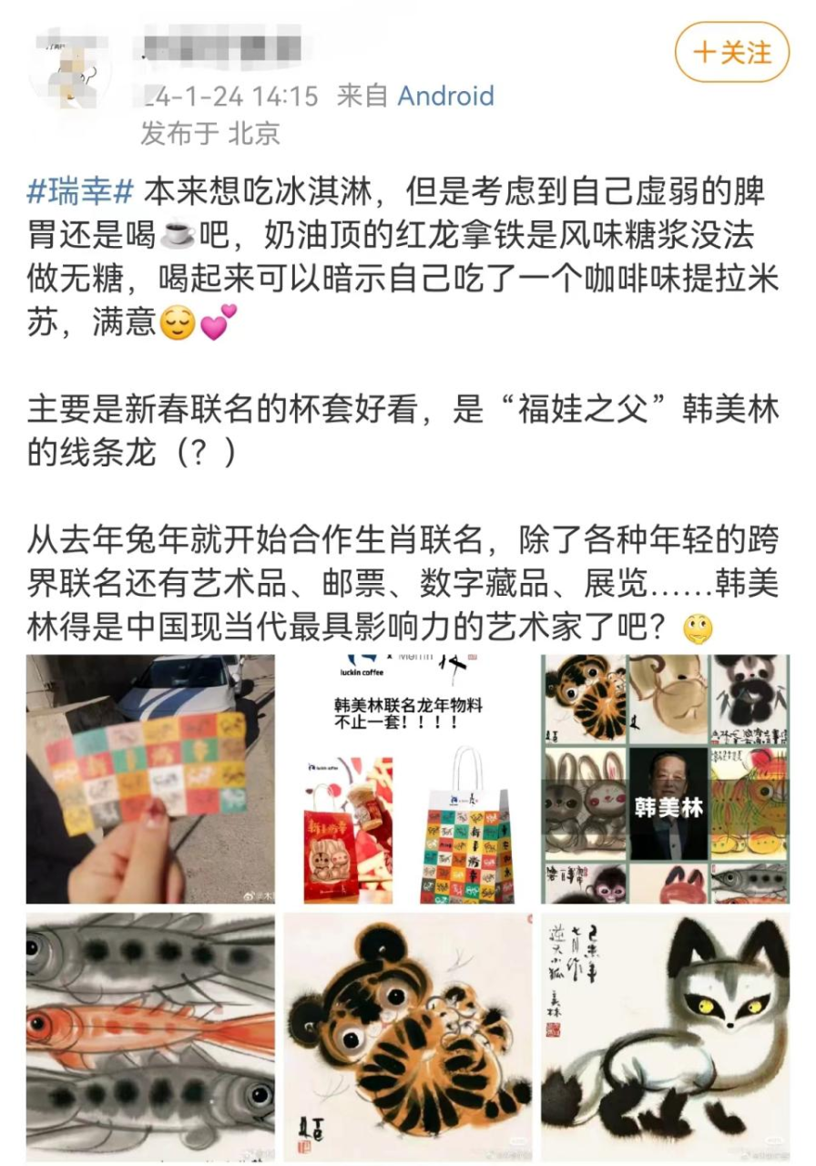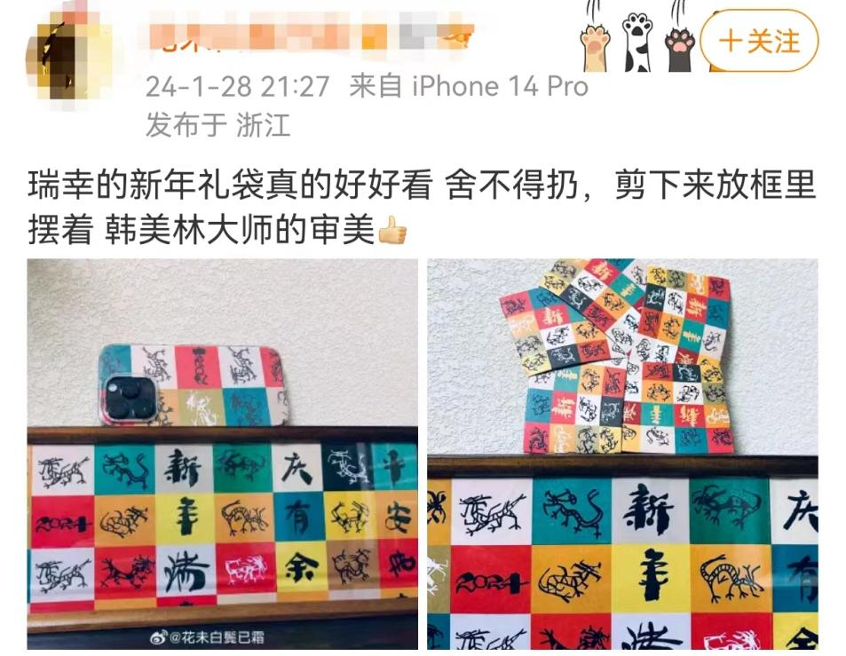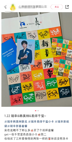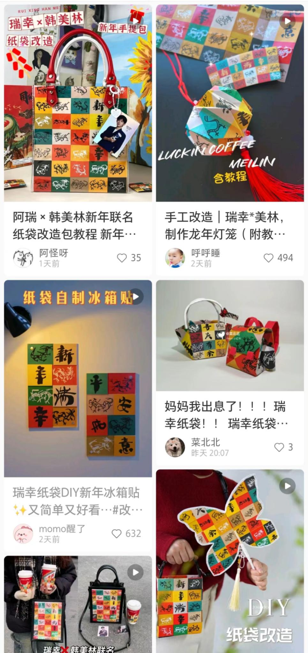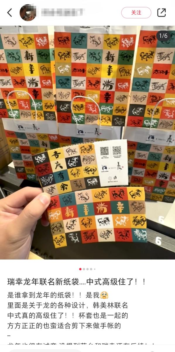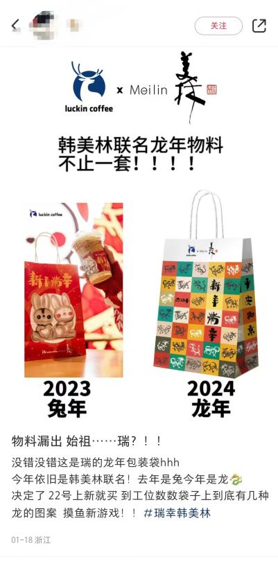 今年已经是瑞幸与韩美林的第二次生肖联名合作,品牌的长期主义姿态也让用户有所感知。瑞幸一直有一批忠实的包装收藏控用户,自从韩美林的龙年联名上线以来,去年的兔年合作纸袋又拉动一波关注,如果瑞幸的生肖联名包装真的能持续12年,那确实能满足一批收藏爱好者的收集心态!