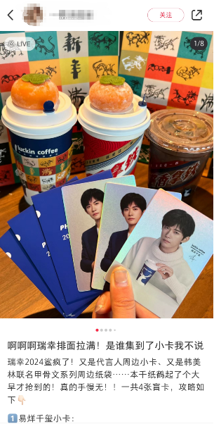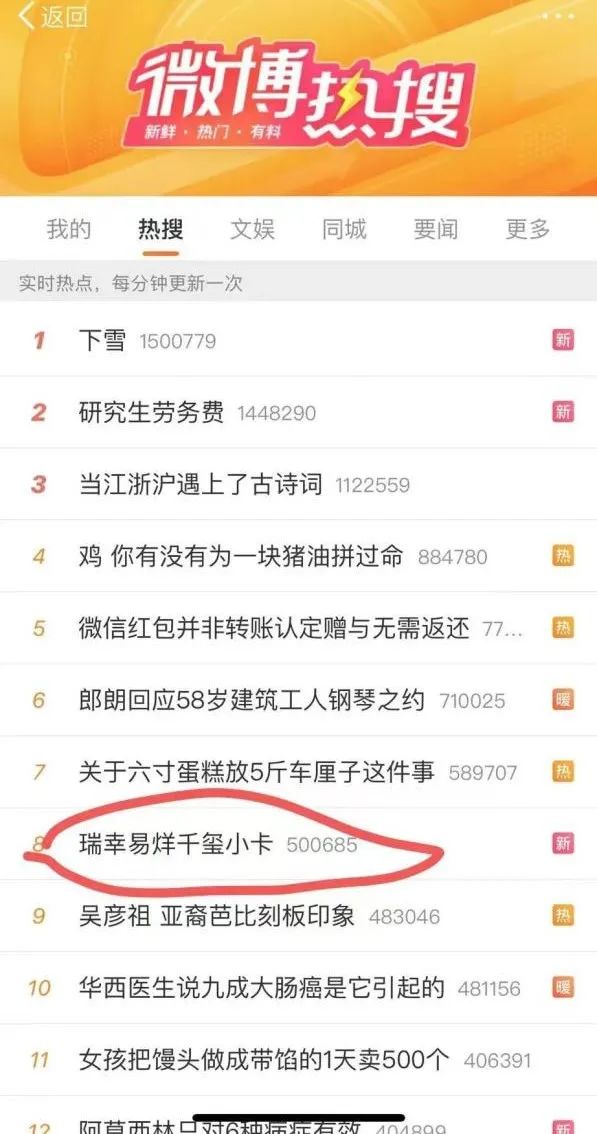 与此同时,#瑞幸易烊千玺小卡#话题登上微博热搜榜,引发热烈讨论。虽说对于瑞幸来说,上热搜已经是常事,去年一系列花活多次冲进热搜,但是送小卡能送出这种阵仗的确实非常少见。