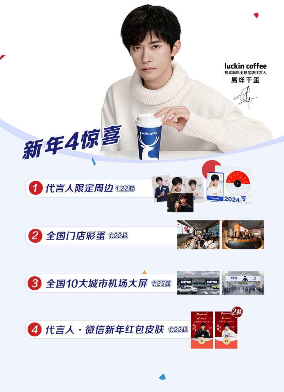 其实小卡、立牌这些实物周边这是“四重惊喜”中的一重,瑞幸还为粉丝带来了包含全国门店彩蛋、全国10大城市机场大屏、代言人微信新年红包皮肤在内的多重惊喜,给足了代言人排面。品牌通过代言人的号召力和粉丝热情,刷新了在年轻消费者心中的形象;而粉丝不仅可以收藏偶像的周边和小卡,也能在门店参与惊喜霸屏互动,大大提升了自己的消费体验;而易烊千玺也能通过此次活动,验证自己的商业价值,无疑是一场三方共赢。