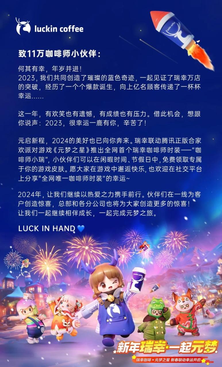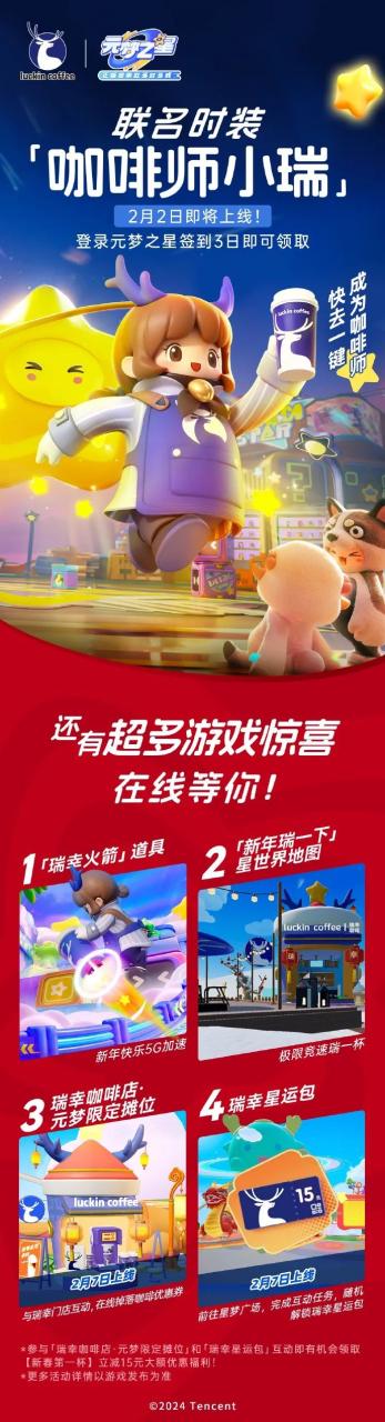 如今,越来越多的年轻人在“回家、吃饭、走亲戚”这些程序化的春节行程里,加上了“开黑打游戏”,想用更加自由舒适的方式,去享受这个难得的假期。为了进一步提升大家的游戏体验,瑞幸也将与主打“快乐”的人气手游《元梦之星》合作,在游戏内定制了瑞幸咖啡师皮肤、烟花火箭道具以及跑酷瑞幸地图,还在深圳打造了元梦主题店。