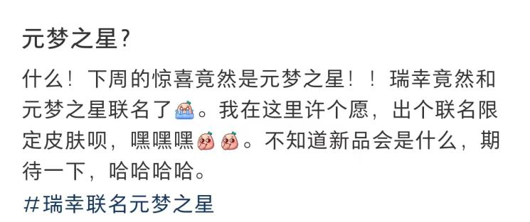 活动上线之前,就有玩家开始期待这次联动,已经和小伙伴约好一起在游戏里跨年。试想三五好友一边喝着瑞幸咖啡、一边在游戏中换上瑞幸咖啡师皮肤截图,口腹之欲叠加精神食粮的梦幻联动,简直就是给玩家们的新年礼物。
