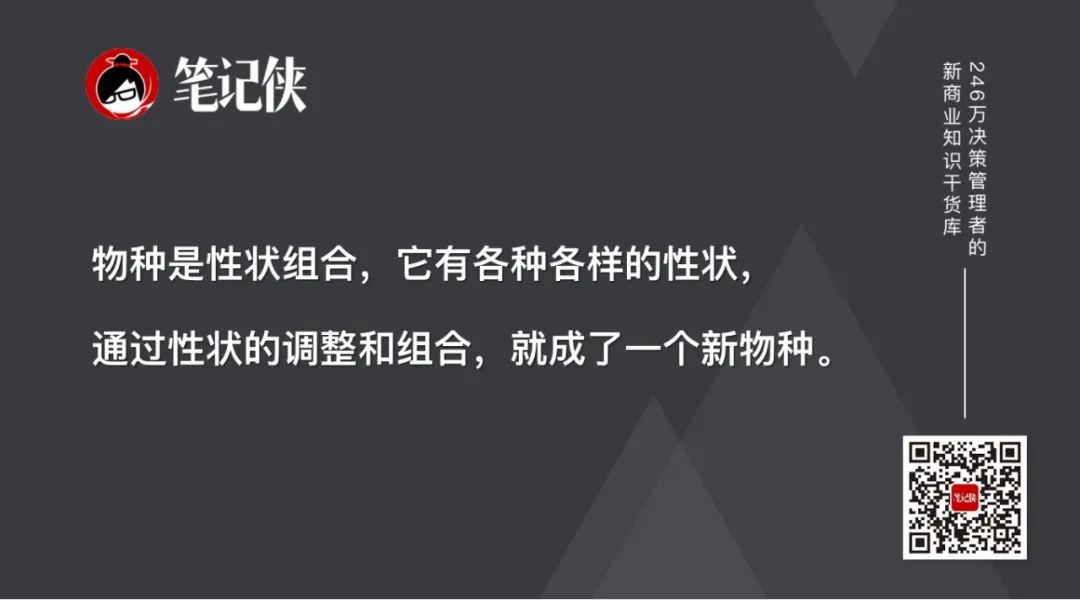 物种是性状组合,它有各种各样的性状,性状形成一个合适的组合,就成了一个新物种。有些物种看上去很旧,加入了一个新的性状或者微调一个性状时,就完全不一样了。