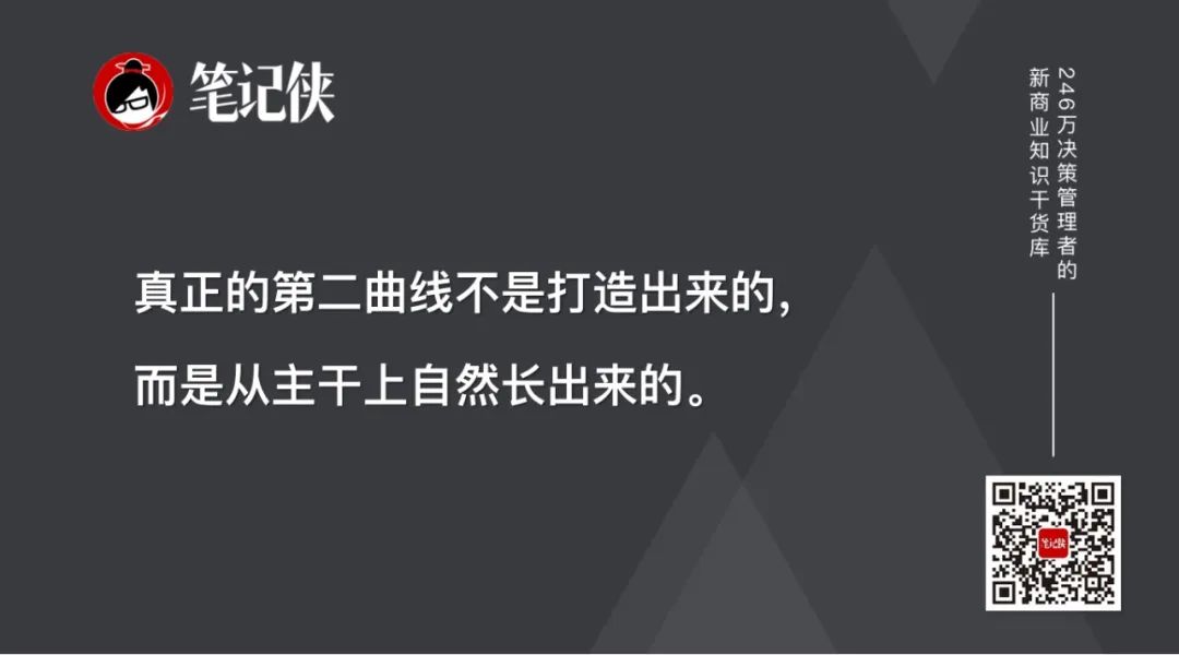 所以,真正的第二曲线不是打造出来的,而是从主干上自然长出来的,主干里面暗藏了很多枝子,才能长出来这个枝条。