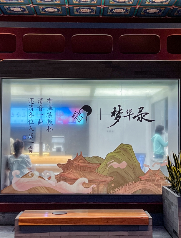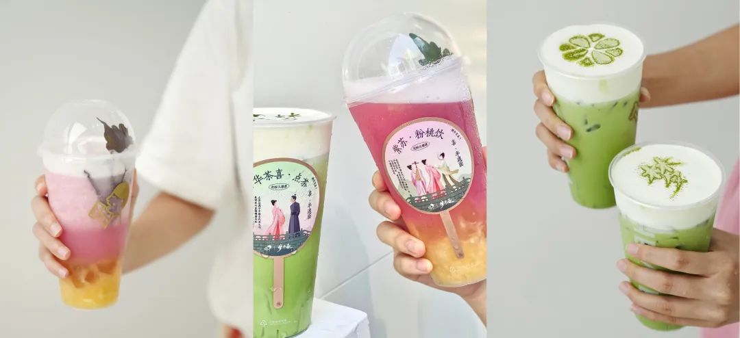 以此前喜茶与《梦华录》的联名活动打造为例,喜茶将广州天环广场LAB店、成都宽窄巷子店、北京前门大街店、深圳京基KK MALL店共四家门店特别设置为【喜·半遮面】主题店,不仅有主题空间陈列及互动,堂食顾客还可以在梦华茶喜·点茶的芝士顶上欣赏到灵感来自于《梦华录》斗茶场景的两款花形,由喜茶调饮师以传统器具——茶针,逐笔勾画而成。