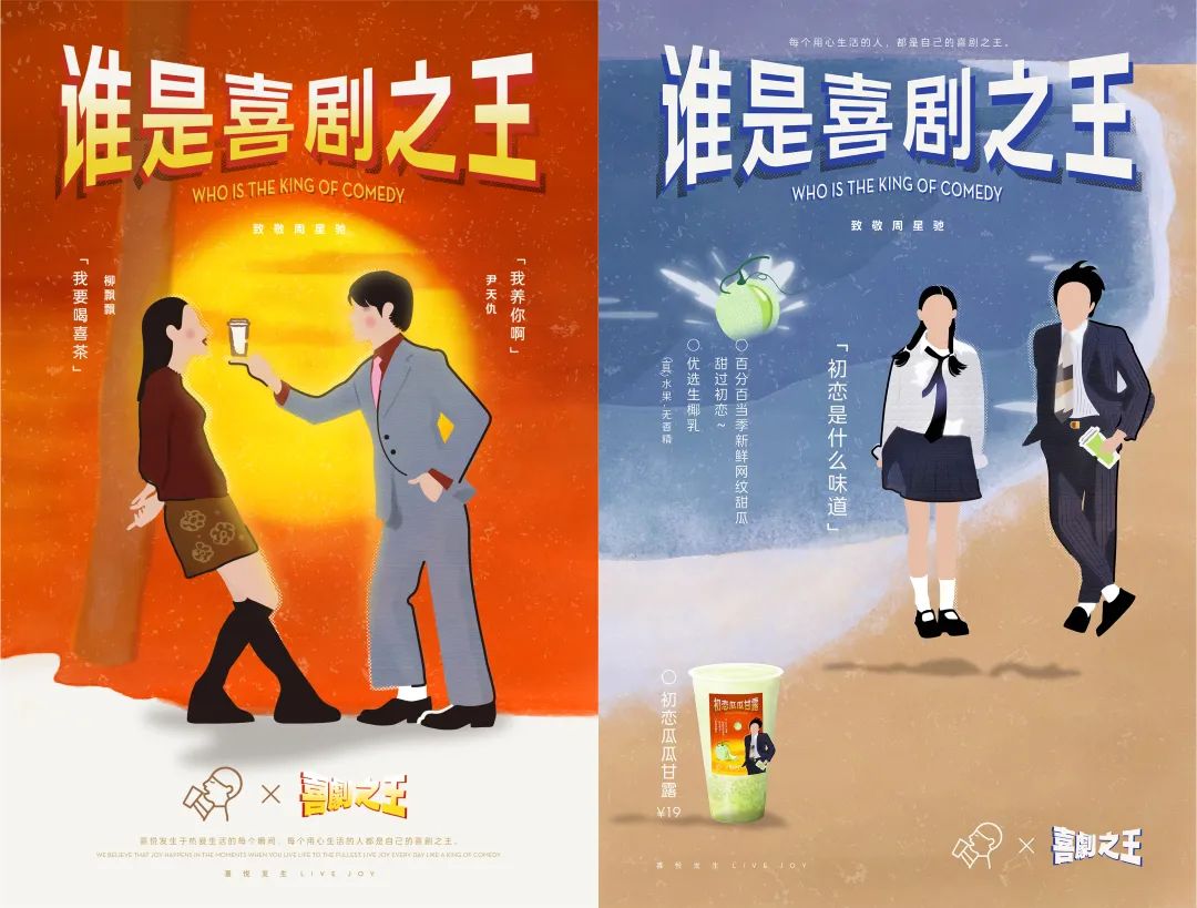 比如,之前喜茶与《喜剧之王》的联名中,打出的联名主题就是“每个用心生活的人,都是自己的喜剧之王”,很好诠释了喜茶“喜悦发生”的品牌精神。