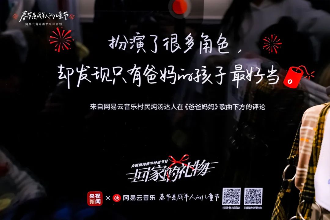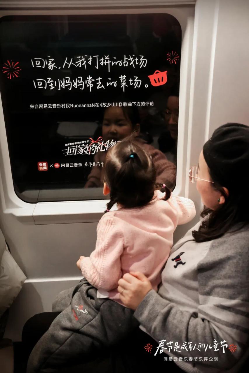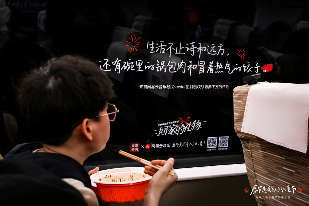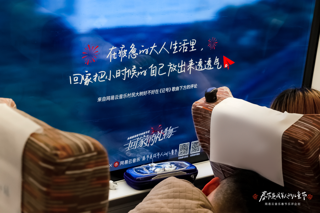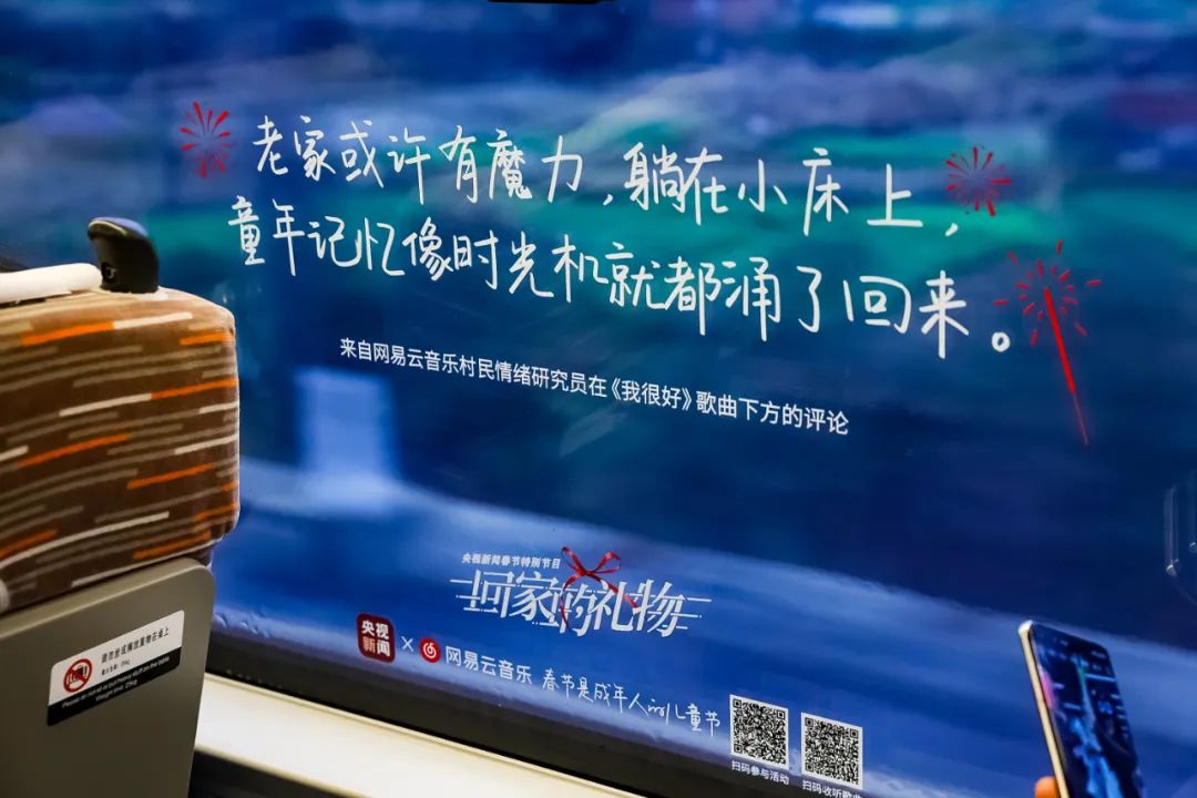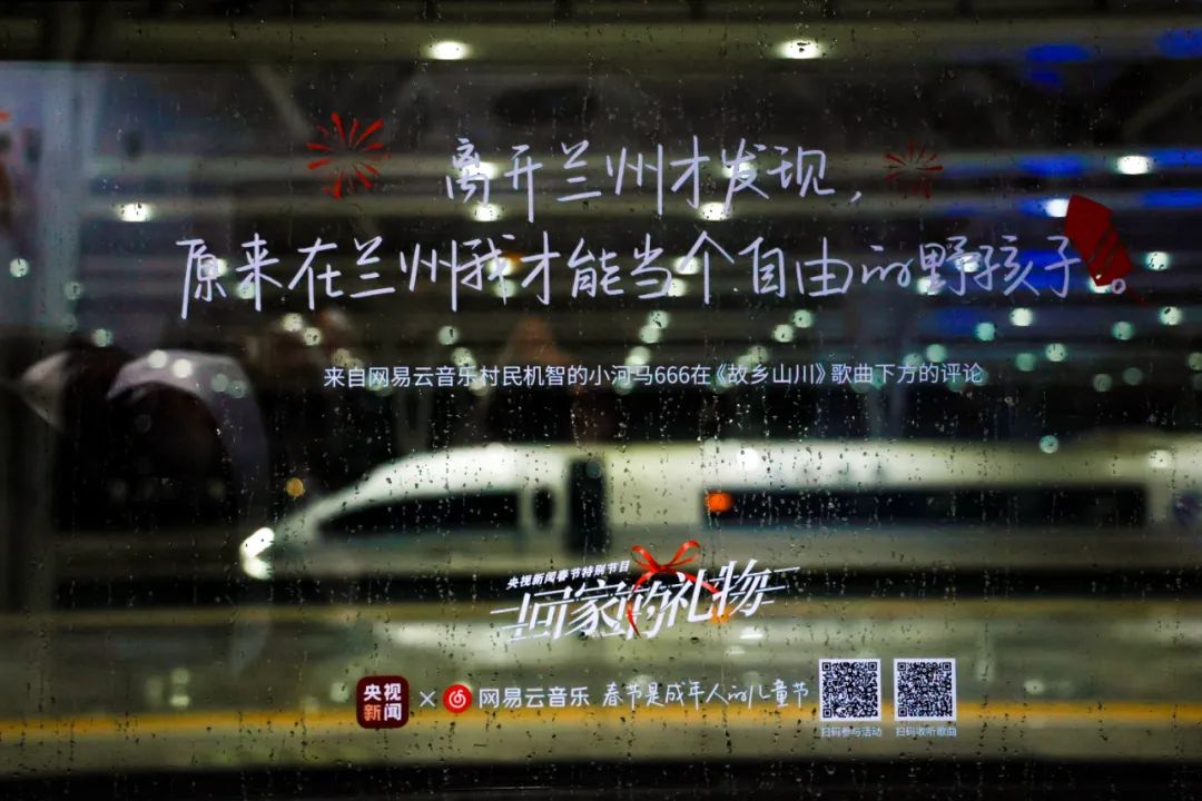 这一次,网易云音乐又联合央视新闻,在全国十余条春运专列的车窗上写下了云村村民的乐评,纵横跨越全国家乡,陪伴用户一路回家。