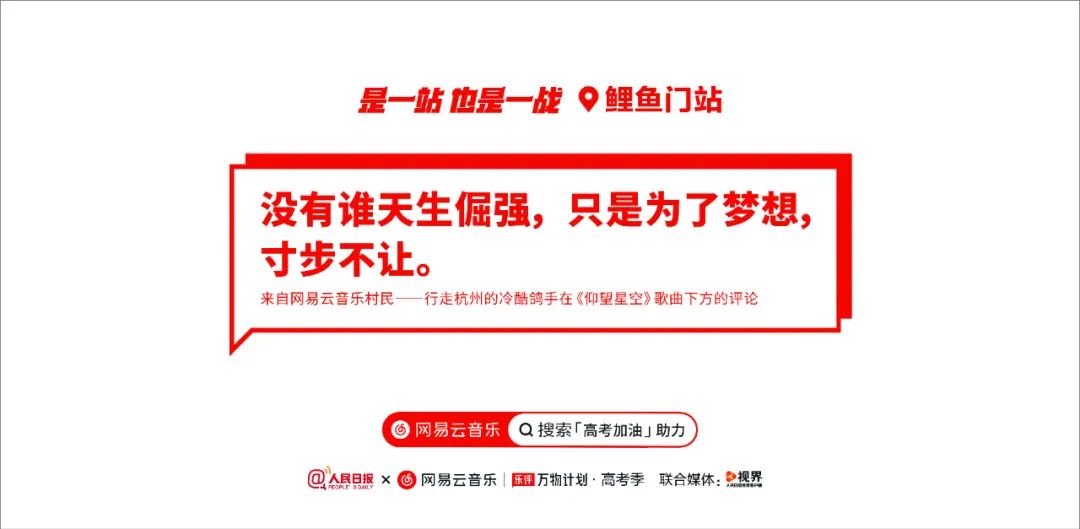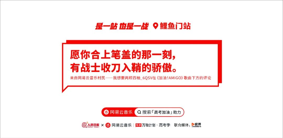 去年高考季的时候,网易云音乐精选18条云村乐评,写在了深圳“鲤鱼门”地铁站内。借斗志满满的乐评文案,为高考生加油打气,祝福考生“鲤鱼跃龙门”。