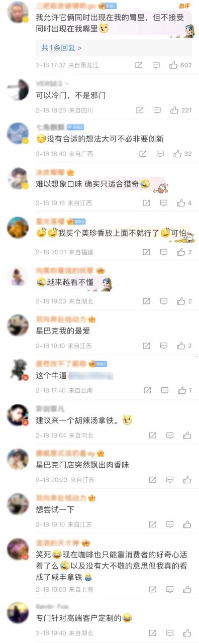 评论褒贬不一。有人表示想要尝试,有人指出看不懂、邪门、可怕,有人调侃是星巴克专门针对高端客户定制的……甚至,有人帮品牌未来产品创新提出了新的思路,热闹至极。