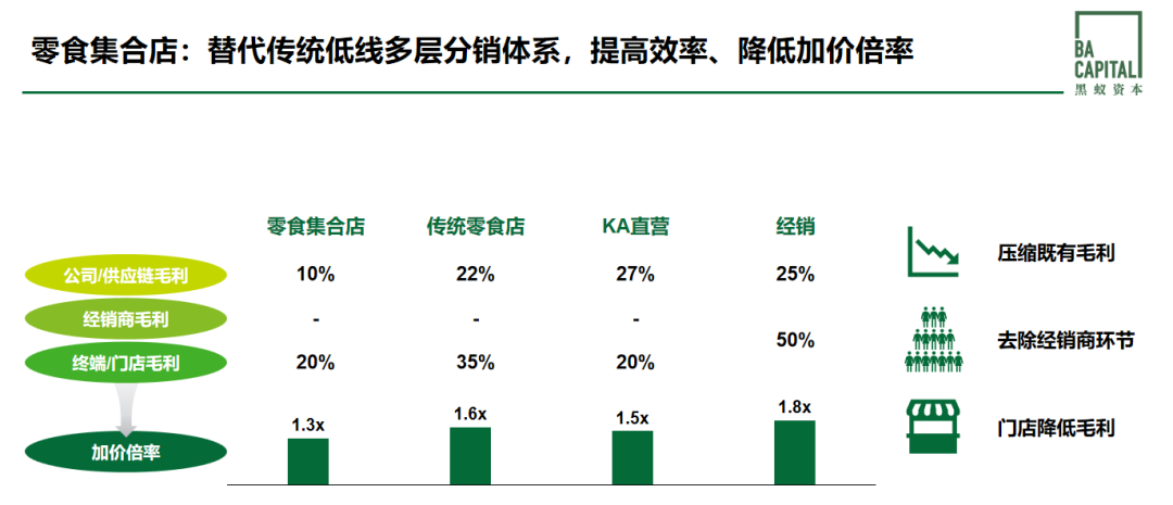 1、零食集合店:替代传统低线多层分销体系,提高效率、降低加价倍率