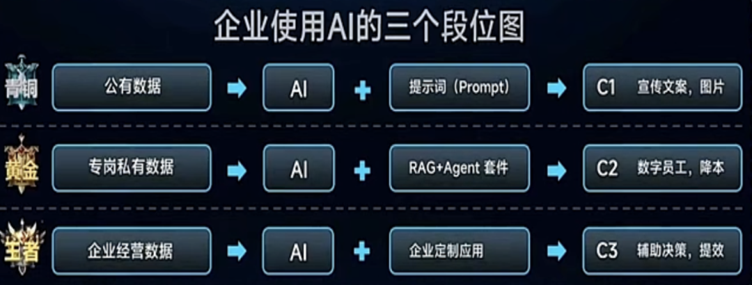 青铜段位的企业,使用的是开放性的公有数据和开放性的通用大模型,内部员工对提示词(prompt)进行学习,就可以将一些宣传文案和设计工作转由AI来辅助完成,这是大多数企业正在做的一项工作。