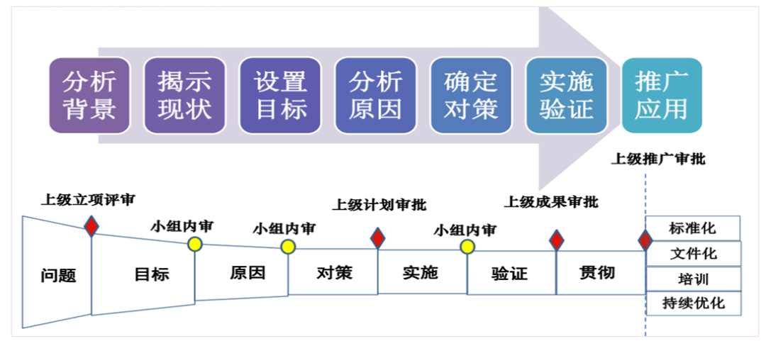 我们总结了课题攻关的七步法:分析背景、揭示现状、设置目标、分析原因、确定对策、实施验证,最后推广应用。
