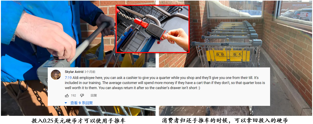 第五,购物车需要用一个硬币来解锁使用,使用后归还到特定位置后,可以拿回硬币,这就让门店减少了员工的数量。