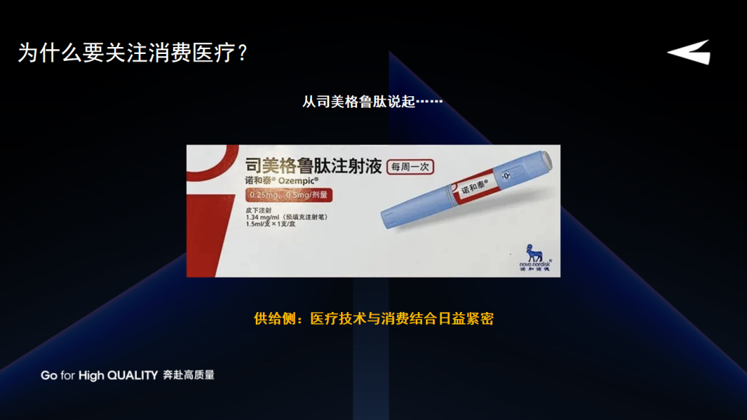 先从供给侧看,以2022年开始火的一款产品——司美格鲁肽为例,它是诺和诺德在2012年推出的针对二型糖尿病患者的药物,但在实际使用过程中,人们发现它能促进胰岛素分泌并抑制抗胰高糖素分泌,所以在体重管理上有非常好的效果。