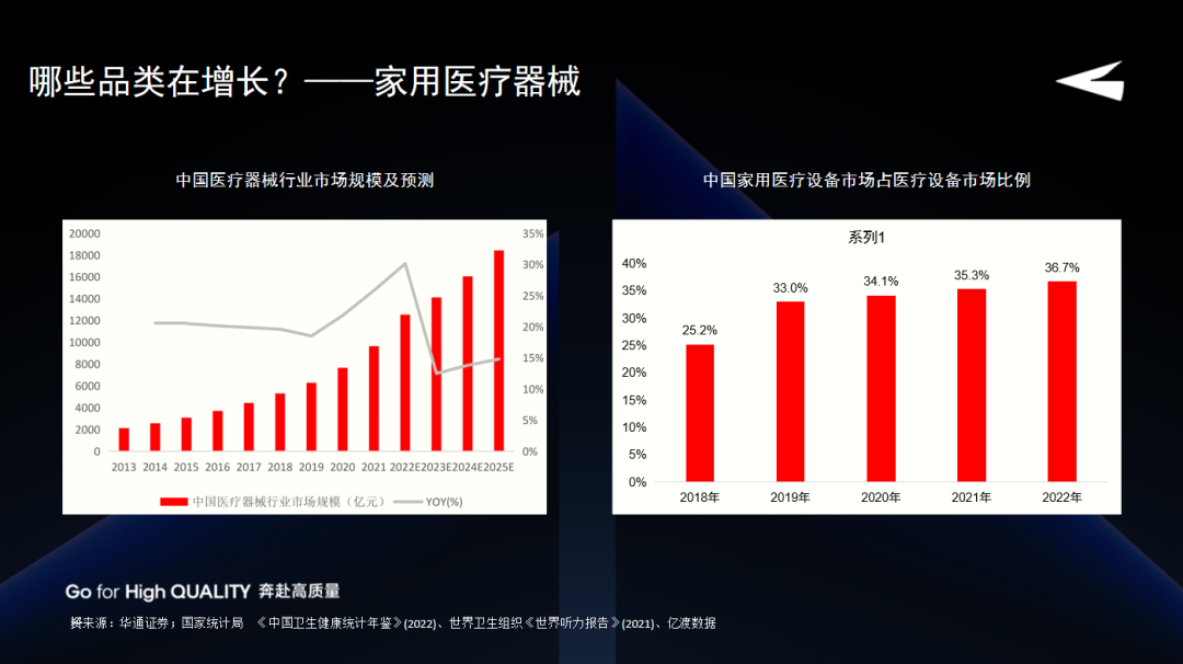 其中一个显著的变化是,家用医疗设备市场在整个医疗设备市场的占比迅速提升,从2018年的25%增长至2022年的接近37%,五年间提升了约12%。