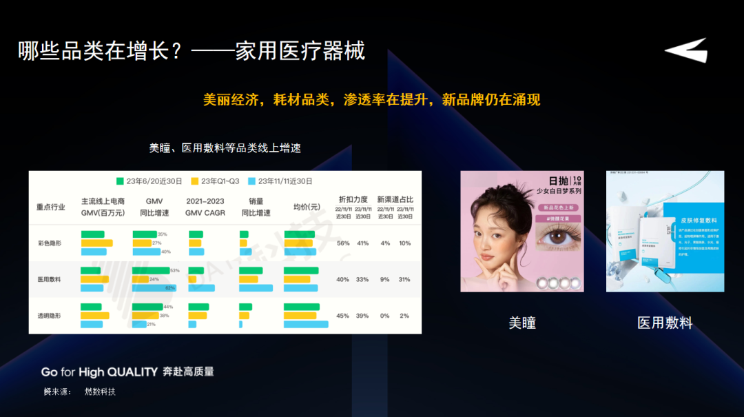 根据燃数科技统计的数据,在2023年618、双十一以及1-3季度期间,彩色隐形眼镜、医用敷料及透明隐形眼镜的线上GMV均实现了20%以上的增长,表明这两个品类本身还有渗透率再提升的机会。