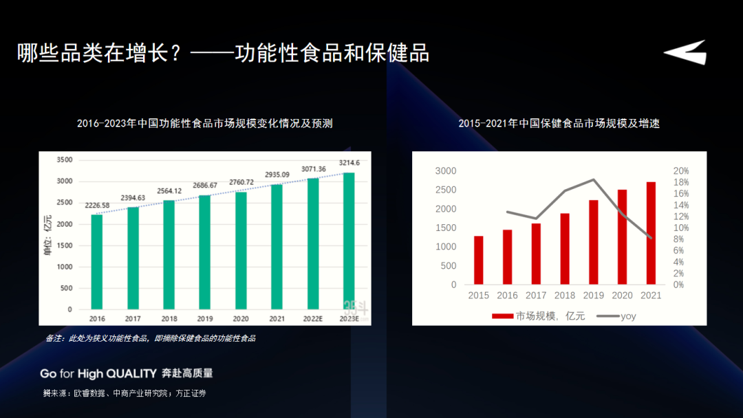 整体来看,二者都在持续增长,增长的驱动因素可以用一句话总结:消费者对于精准营养的需求在上升,原料在不断更新。