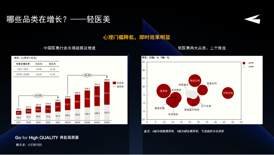 未来估计这个市场仍将以15%以上的速度继续增长,这也是我把轻医美单独列出来讲的原因,在消费医疗领域中,轻医美是不可回避的重要组成部分。