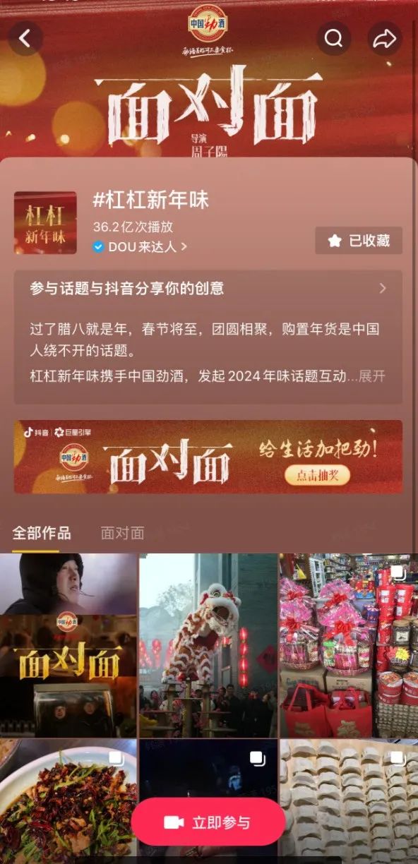 作为内容营销IP,抖音「杠杠新年味」深谙优质、独家内容在社交流量中的牵引力,联合周子陽导演,携手中国劲酒推出龙年微电影《面对面》,以春节团圆为故事背景,讲述了小人物团圆的温情故事。