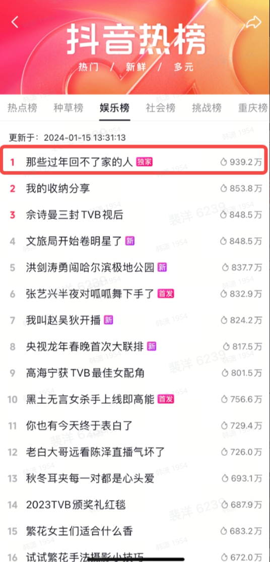 因此,当「杠杠新年味」以IP之名把各种零散的年味内容主题化、聚合在一起形成传播合力,流量自然而然就围绕了过来。相关热点话题#那些过年回不了家的人 ,斩获抖音热点榜TOP 4和抖音娱乐榜TOP 1,有效在碎片化的信息环境中聚合用户的注意力。