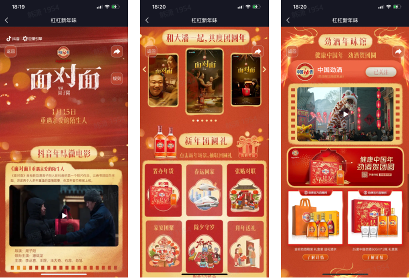 从抖音「杠杠新年味」联动导演周子陽以及潘斌龙等艺人抖音账号,发布预热视频先一步调动起了粉丝及站内用户的关注;到《面对面》以抖音为主阵地展开的全网传播,为劲酒在春节节点凝聚起了大量的注意力。更重要的是抖音「杠杠新年味」还串联全域资源,通过抖音、今日头条、西瓜视频三端资源联动,在三端用放映厅banner、抖音阿拉丁、抖音电影官号、抖音信息流、鲜时光TV精选等多点位进行强覆盖,曝光流量超过1亿。