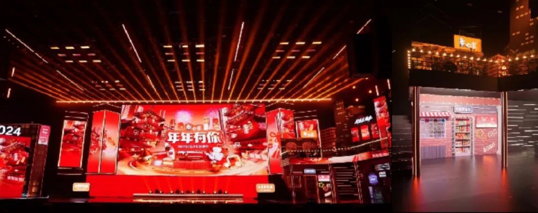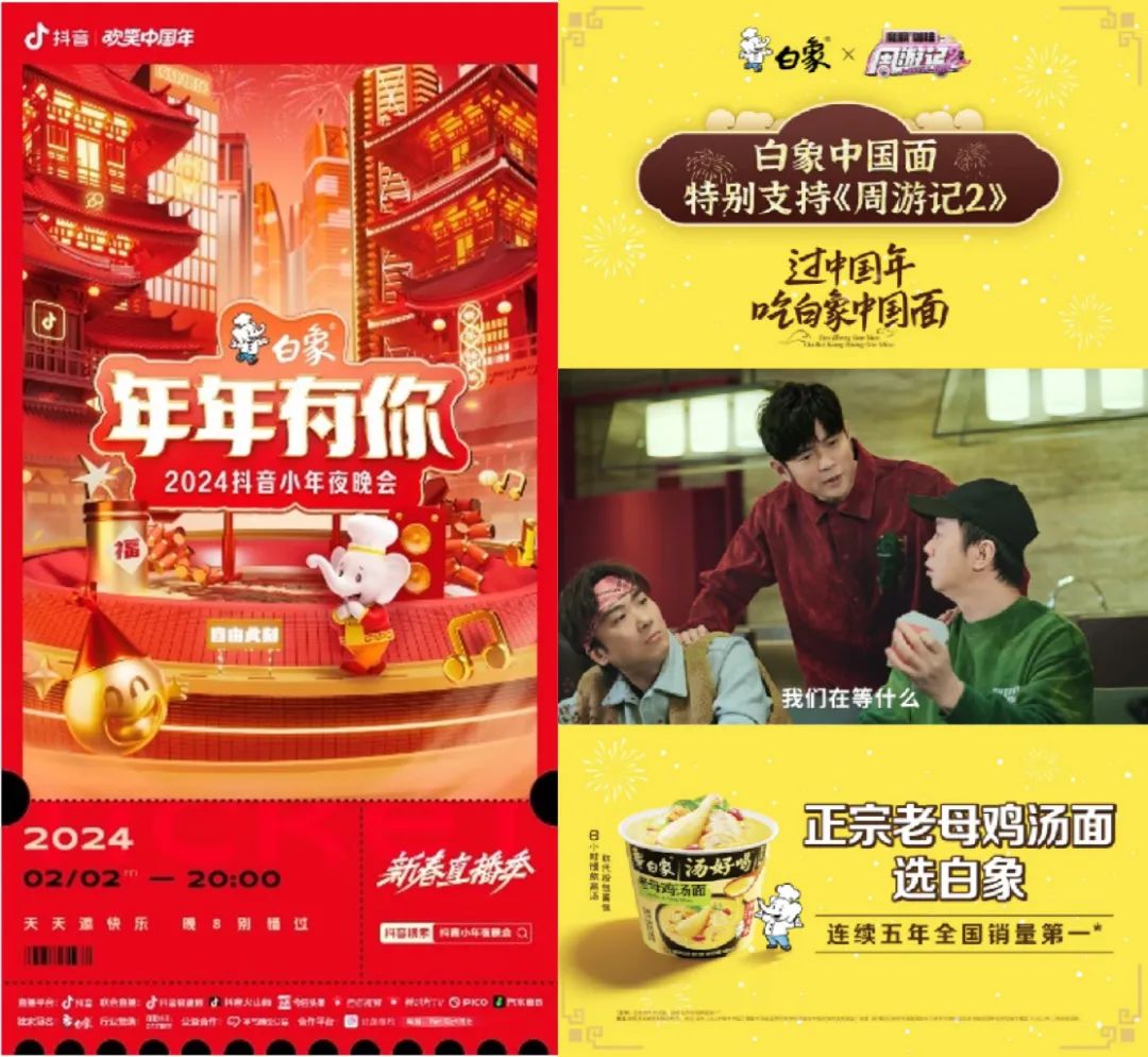 作为独家冠名品牌,白象在抖音平台在线直播的 2024「年年有你」抖音小年夜晚会中 360 度曝光品牌信息。在将近 4 个小时的晚会中,通过主舞台灯箱、侧舞台橱窗、压屏条、麦标、片尾鸣谢及直播落版等形式露出白象品牌,通过晚会花式转场、游走字幕、商业化弹幕、烟花组件形式和线下展厅不断重复地将“过中国年吃白象中国面”植入到观众的潜意识之中。