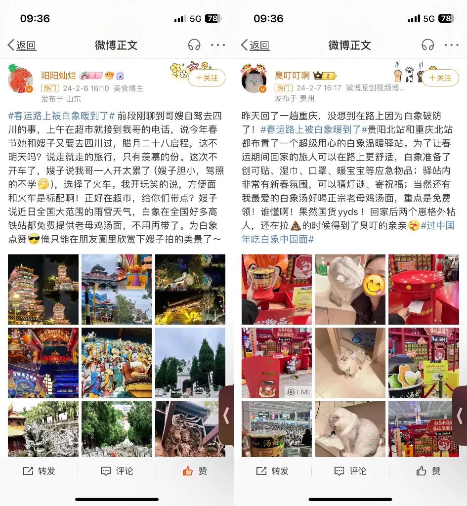 对于风尘仆仆赶路人来说,一碗热腾腾的鸡汤面,既暖胃又暖心,无疑能极大提升品牌好感。而对于白象来说,方便面本就是高铁标配,品牌植入毫不违和。被网友们送上微博热搜的#春运路上被白象暖到了#话题、超过 100 家的官媒报导,就是最好的例证。