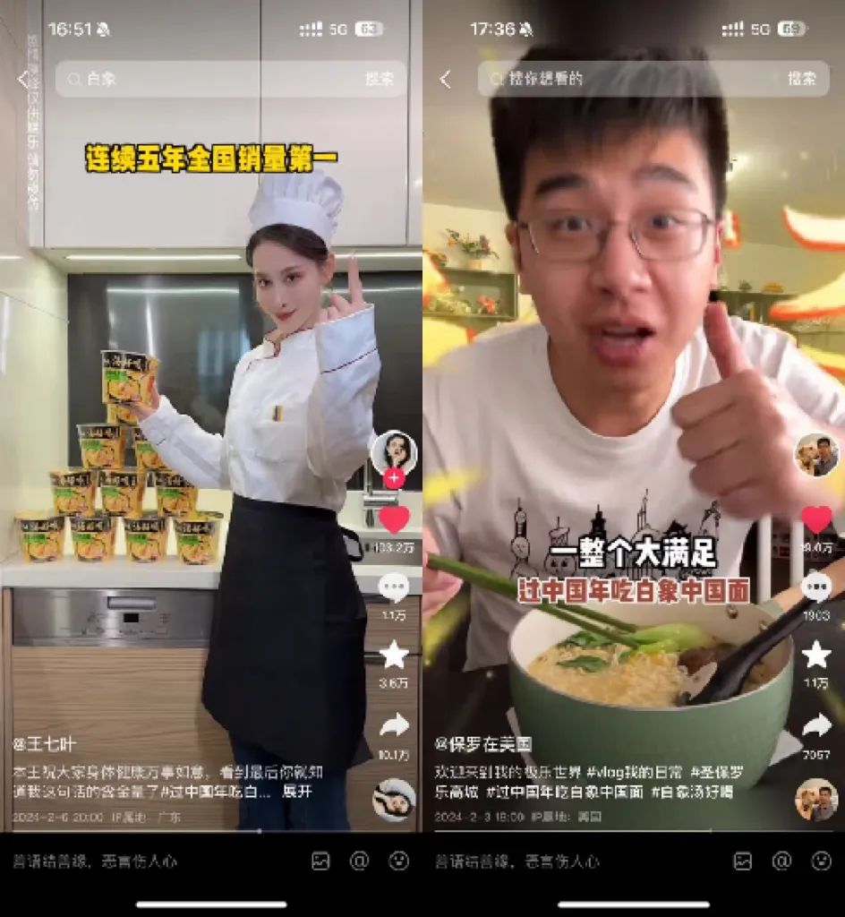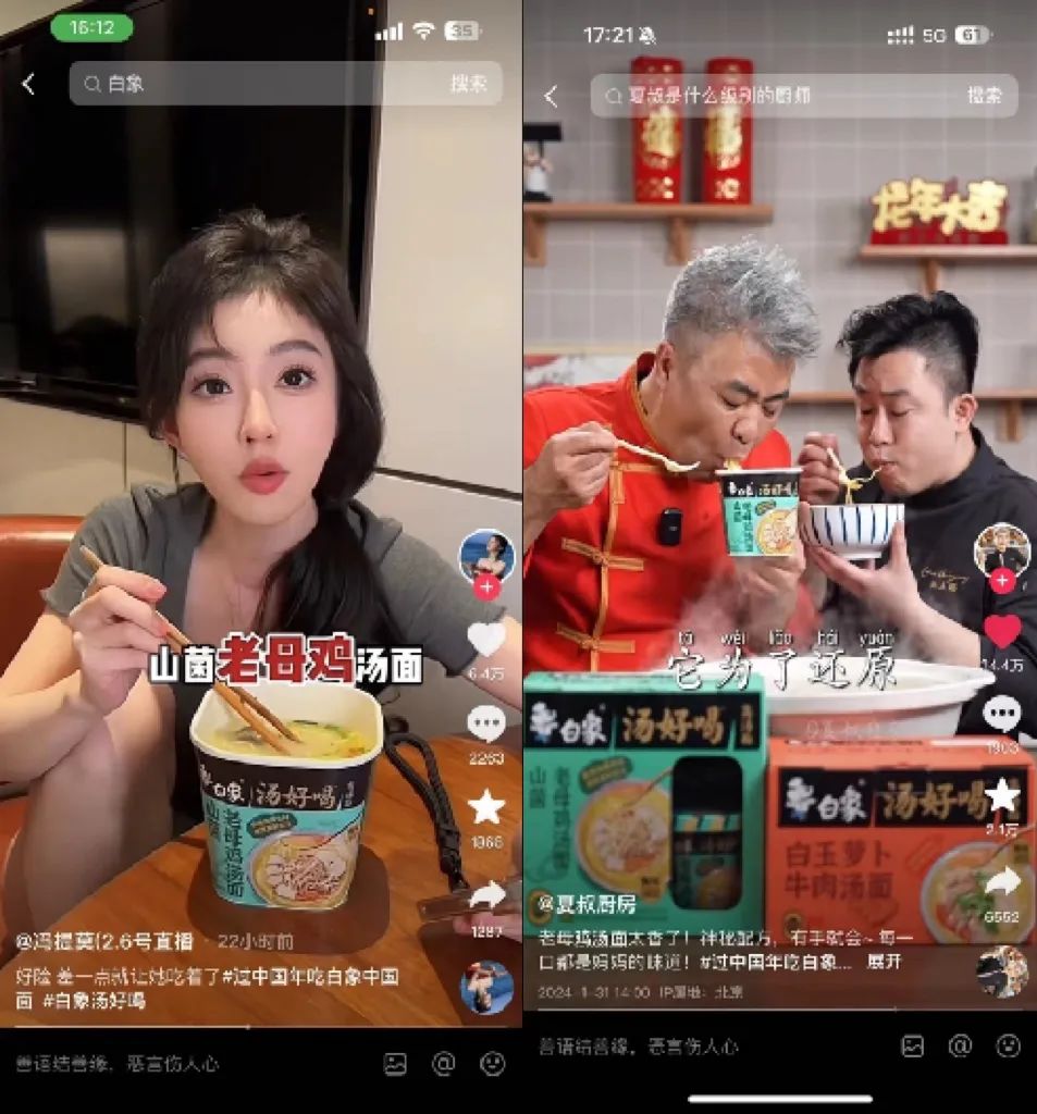 因而,在小年夜晚会前后半个多月的时间里,白象与 86 位抖音及小红书达人策划了系列视频,以晚会二创、创意剧情、美食测评等多维度对“白象汤好喝老母鸡汤面”、以及同系列重磅新品“甄味汤馆”进行全方位种草。借势晚会的高曝光势能密集开展产品种草,实现销售转化。