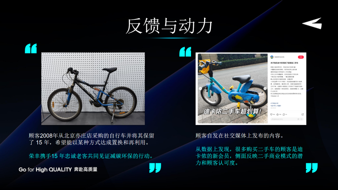 过去一年我们一直在做各种尝试,跑出了非常多的失败案例,而从2023年开春开始,选择把车卖回给迪卡侬的顾客数量直线上涨,也有很多人来选购我们的二手车,甚至很多为此买单的用户都是新会员。