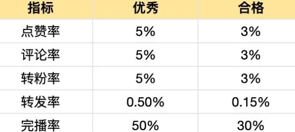 通过初始流量的测试,如果这个视频作品的数据反馈较好。那么继续推荐给下一个更大的流量池测试,层层叠加推荐。其中影响视频的反馈效果:完播率>点赞率>评论率>转发率>转粉率,大致数据反馈标准如下: