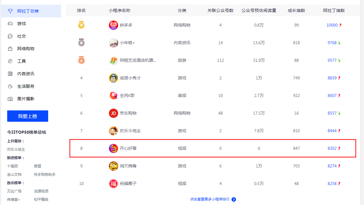 互联网的世界总有很多意外,譬如一个叫“开心好看”的小程序,在阿拉丁小程序排行榜一直占据前十位。